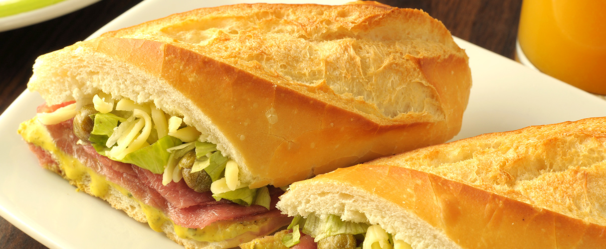 Tentação • baguete parmesão, carne assada, presunto, provolone, vinagrete e maionese